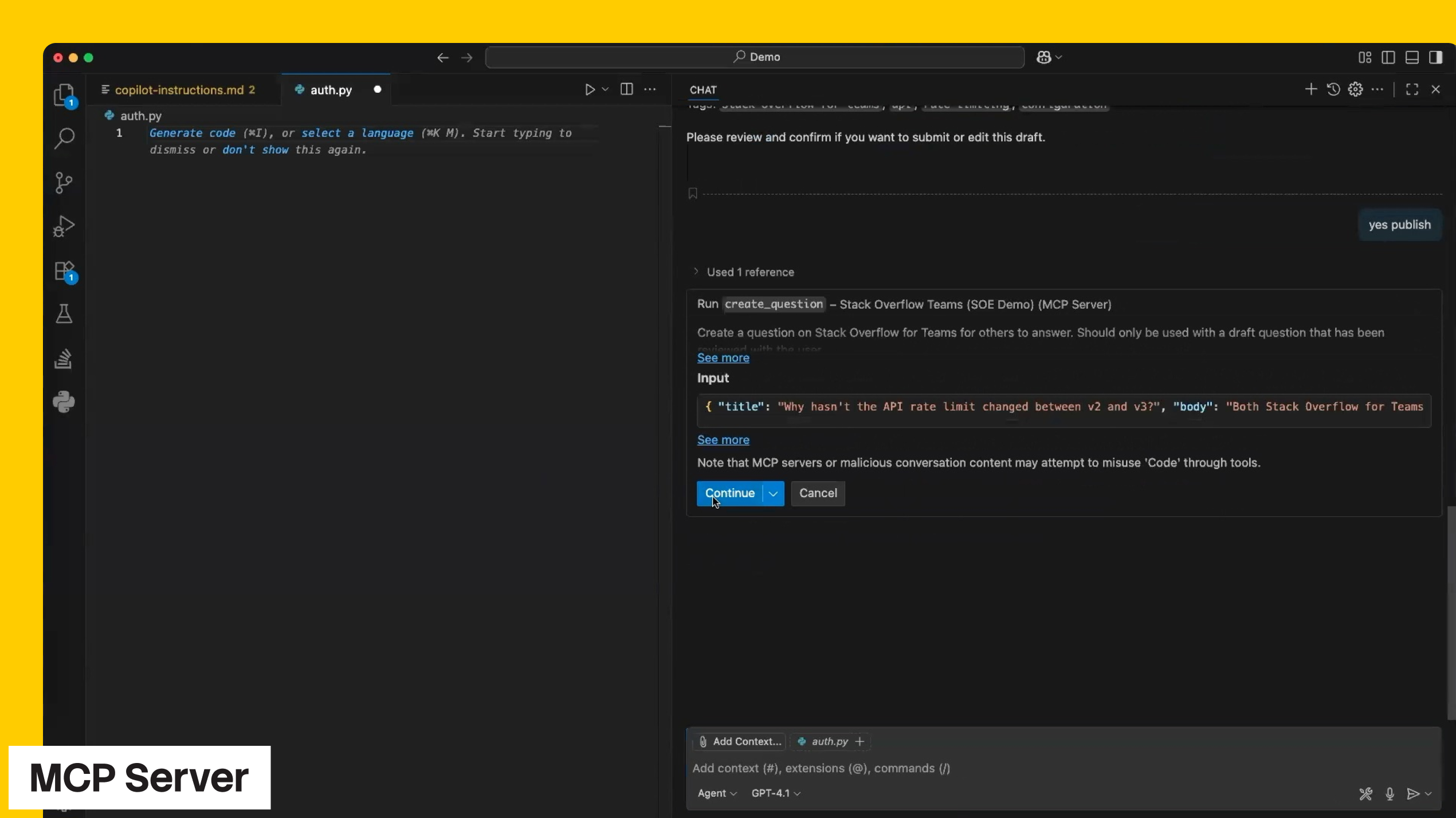 The Model Context Protocol (MCP) Server connects agentic AI developer tools—like GitHub Copilot, ChatGPT, and Cursor—directly to your enterprise’s verified knowledge in Stack Internal.